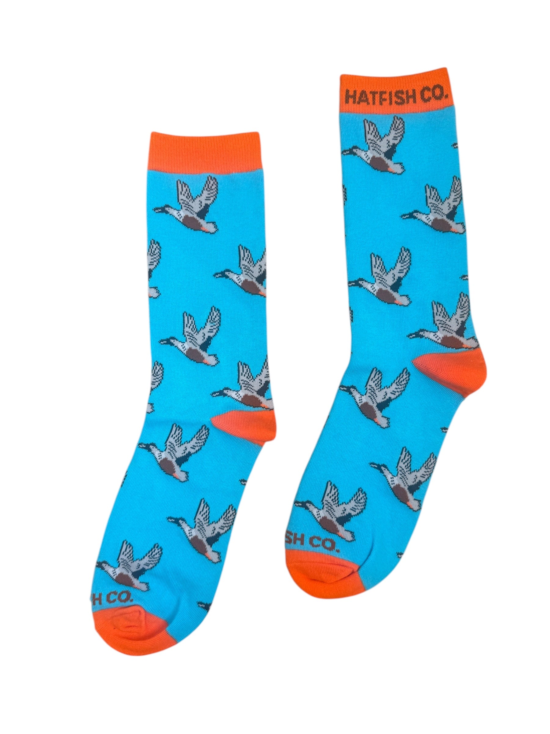 Sky blue sock with safety orange trim and a flying spoonbill design